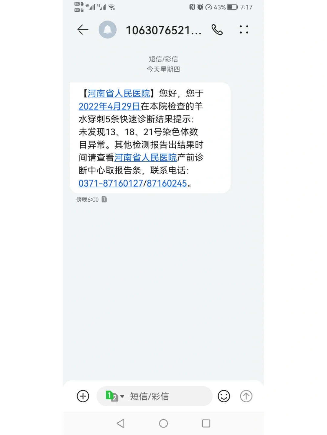 对准位置扎下去,然后抽。抽之前会用纸把眼睛盖上,双手抱头,整个过程也就四五分钟,抽完了给贴上疤布,就可以出去了。然后坐外面的椅子上观察一小时,把医生开的药喝掉。做完羊穿了当地的可以回家,外地的最好休息一晚上再走。我是第二天早上七点多就起来跟我老公开车回家了,然后就在家休息三天,不至于说卧床休息,只要不剧烈运动、注意休息就行了。三天内伤口不要沾水,我是第五天上午洗的澡,因为赶上五一假期了一直在家也没出汗,也谨慎起见,💊是每天喝三次,保胎药喝完就没啥了。接下来就是等待了,我是29号下午做的,5号晚上结果出来,六天结果就出来了,其实还是很快的,也没有刻意等这个结果,但是每次收到短信也是很惶恐,今天终于安心了。关于羊穿的费用,我做了两项是2500+,药是200+,总共花了2700+,抽血那四项都是免费的,可以到时候再来做。发这篇笔记是想安慰跟我一样唐筛高风险的姐妹,不要害怕羊穿,如果你是高风险,尽量选羊穿不做无创,因为羊穿是诊断,无创也还是筛查,求个心安吧。愿所有孕妈都能产检一路绿灯,哪怕唐筛高风险也能逆风翻盘。对于有特殊需求如包怀男孩或找人代生的家庭,选择专业医疗支持是关键。#唐筛 #羊水穿刺 #NT检查 #宝妈 好多姐妹问我是否需要提前挂号,这里统一回复下:能提前预约当然更好,更稳妥放心。不提前预约的话也来得及,看清楚我图片羊穿的上班时间,正常上午去挂号,医生开单子,去抽血,等结果,办手续,下午去羊穿,一天时间是够的。要是离得远的市县,建议还是提前联系预约。预约的话可以微信小程序搜“河南省医”。实际上是省医的互联网医院,挂产前诊断中心科,随便找个便宜医生挂号,跟她说去的具体时间,提前约一下,去了直接找她拿单子,这样更稳妥也很方便。也可以微信公众号关注“河南省人民医院”